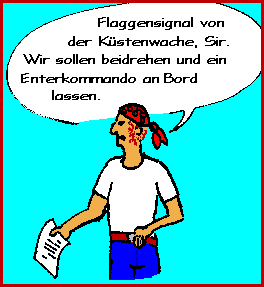 Aus diesem Grunde wurden branchenspezifische Erweiterungen des kommunikatorischen Instrumentariums gesucht und gefunden. Von den wichtigsten Kommunikationsmedien eines Piraten, der Bootsmannspfeife (nur zur interen Kommunikation), den Ton- und Leuchtsignalen (externe Kommunikation, vorallem bei Nacht) und dem Flaggen-ABC (externe Kommunikation bei Tag) soll hier zunächt nur das Flaggen-ABC vorgestellt werden.